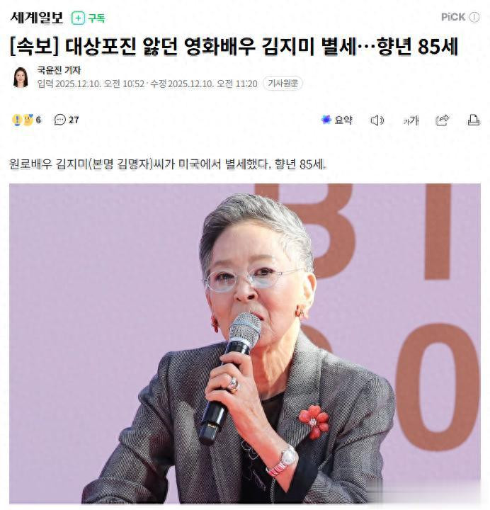 据韩国电影人总联合会与韩国电影演员协会等透露,韩国影坛传奇女星、被誉为“韩国的伊丽莎白·泰勒”的演员金芝美(本名金明子)已经离世,享年85岁。
